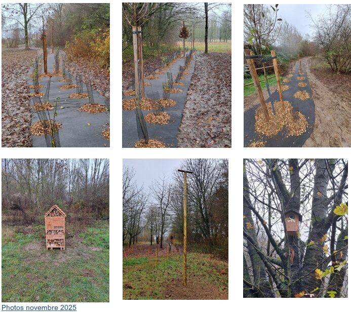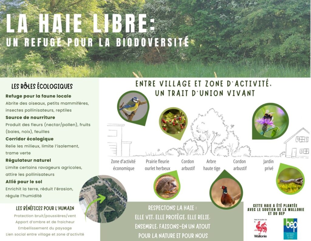 Pour favoriser le passage des espèces et enrichir la flore locale, une haie champêtre de 150 mètres a été plantée. Elle se compose de 12 arbres de haute tige et de 300 arbustes mellifères, regroupant 18 essences locales différentes. Une prairie fleurie de 450 m² complète ce dispositif, offrant un refuge précieux pour les insectes pollinisateurs.